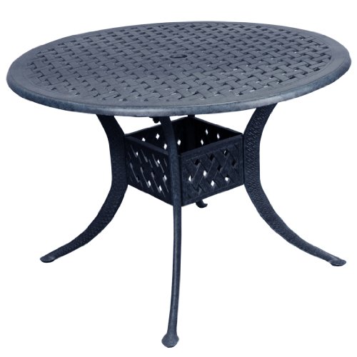 Add a classic touch to any patio or intimate outdoor setting with this beautiful 42-inch round cast aluminum dining table. Featuring a classic, woven pattern and constructed of solid cast aluminum, this dining table will last for years to come. Create the perfect outdoor dining set by pairing this table with several sets of our matching cast aluminum dining chairs. Table measures 42 inches in diameter and is 30 inches tall.