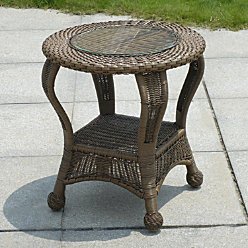 . The graceful curves of the Winchester Resin Wicker Outdoor Furniture Collection invite you to relax in style. This quality outdoor furniture is woven of all-weather resin wicker so you know its beauty will last. Its graceful lines and cocoa finish are reminiscent of classic wicker styles, but the flat/round combo weave and weather-resistant materials are strictly modern. The Winchester Resin Wicker Outdoor Furniture Collection dries quickly after rain, making it ideal for use on a patio, deck, or porch. Both the round end table and oval coffee table feature a bottom shelf and an optional glass top for a modern, worry-free surface. All seating pieces include thick, USA-made cushions in your choice of stylish colors and patterns. When ordering Winchester seating pieces please specify cushion style/color: Sunbrella 100% solution dyed acrylic: canvas spa blue, canvas buttercup, canvas palm, Dimone flame stripe, or Spectrum cayenne.